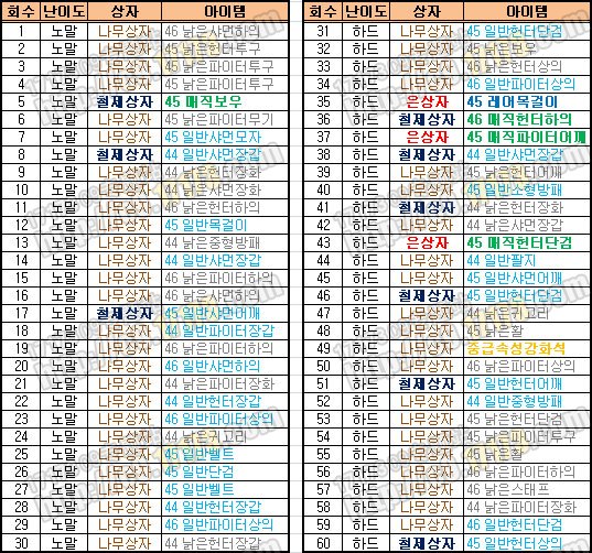 实验副本普通和困难的掉落几率,普通30次困难30次。副本为第3大陆的“灵魂山谷”为了大家方便看表,发一些韩语对照노말=普通 ,하드=困难나무상자=木箱子,철제상자=铁箱子,은상자=银箱子困难模式下出现过21次木箱子,6次铁箱子和3次银箱子,出项银箱子的情况下,有爆出绿色装备2次