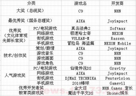 12月23日下午,2009韩国游戏大奖颁奖典礼在首尔三星洞召开。颁奖典礼现场公开了大奖获奖作《C9》,最优秀奖获奖作《AIKA》等13个领域25个(名)获奖游戏和个人。其中,韩国NHN公司旗下的MMORPG《C9》独揽了大奖(总统奖)等五个奖项。另外,此次获奖的网络游戏还有MMO