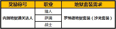 在内测结束时,所有47级以上,拥有与自身职业匹配的47级罗纳德地狱套装的角色可直接获得不删档限量极品称号。