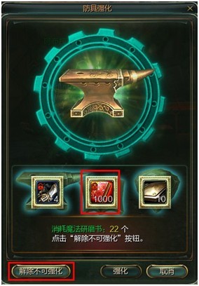 强化UI说明:如果装备在强化过程中变为不可强化道具,在UI界面中间栏位中放入解除不可强化状态的道具[魔法研磨书] (商城中销售),然后点击[解除不可强化]按钮即可将道具重置为[可强化]状态。