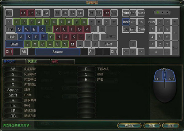1)自定义键盘规则:初始键盘上蓝色为[基础操作]键、绿色为[快捷]键、红色为[系统]键、灰色为[可用键]。玩家可根据自己的需要自己各操作在键盘上对应的输入,比如说:向前移动初始化设置为[W],可以将[o]键改为向前移动键。